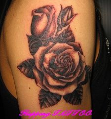 腕上部に満開の薔薇・咲き始め・つぼみの三位一体を惜しみなく詰め込んだ今回の作品。