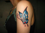 シャープなラインと青のグラデーションが目を引くTATTOO。