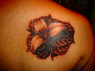 この作品をデザインするにあたって白い花びらが目立つように、花びらと周りの葉っぱの濃淡のバランスを強調しました。お互いイスに座っての施術だったので体勢的にきつかったですが、