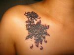 『今回のオーダーが《小さい範囲にリアルな菊》との事だったので、ファインラインではなくブラック&グレイで、菊の花びら一枚一枚をはっきりさせたかったから。ファインラインでは菊自体がほやけてしまい逆にリアルに見えなくなると考えた。』